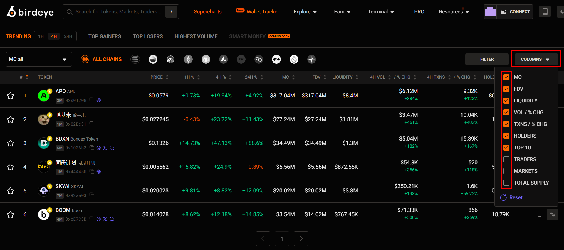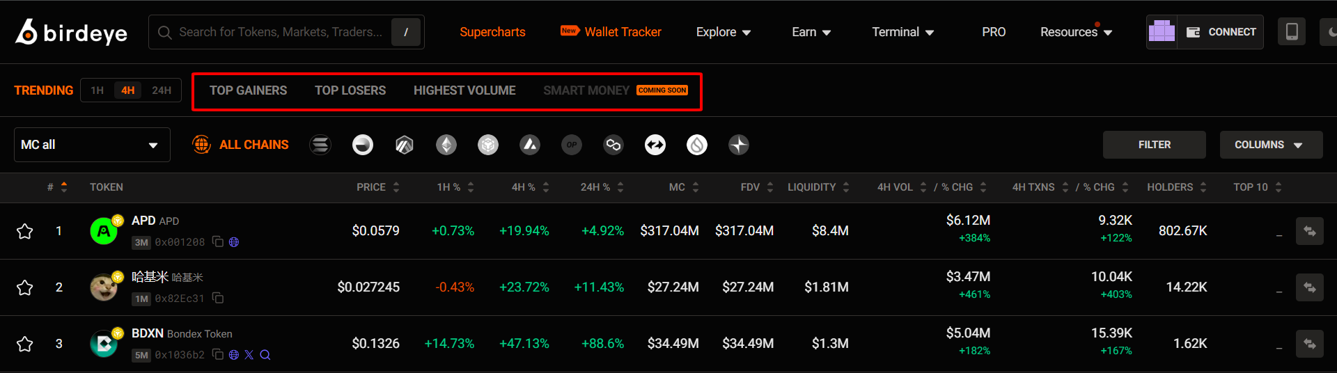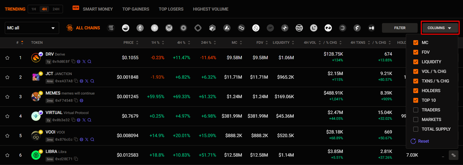 Categories like Trending, Top Gainers, Top Losers and Highest Volume provide pre-filtered lists of tokens based on popular criteria. This helps you quickly identify noteworthy tokens without having to filter them yourself.