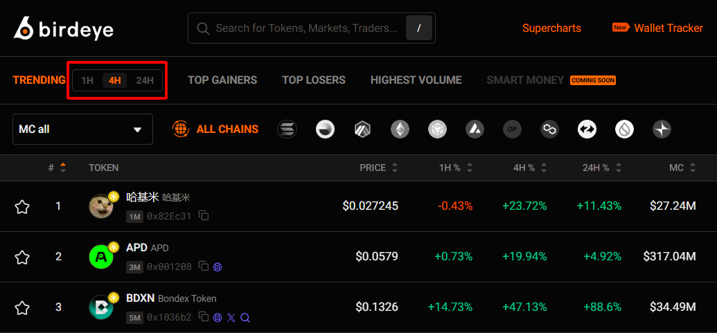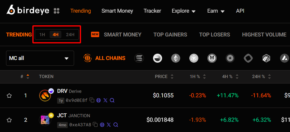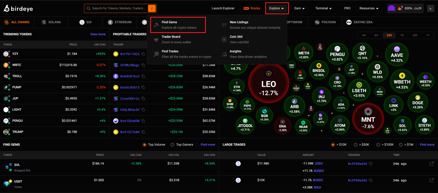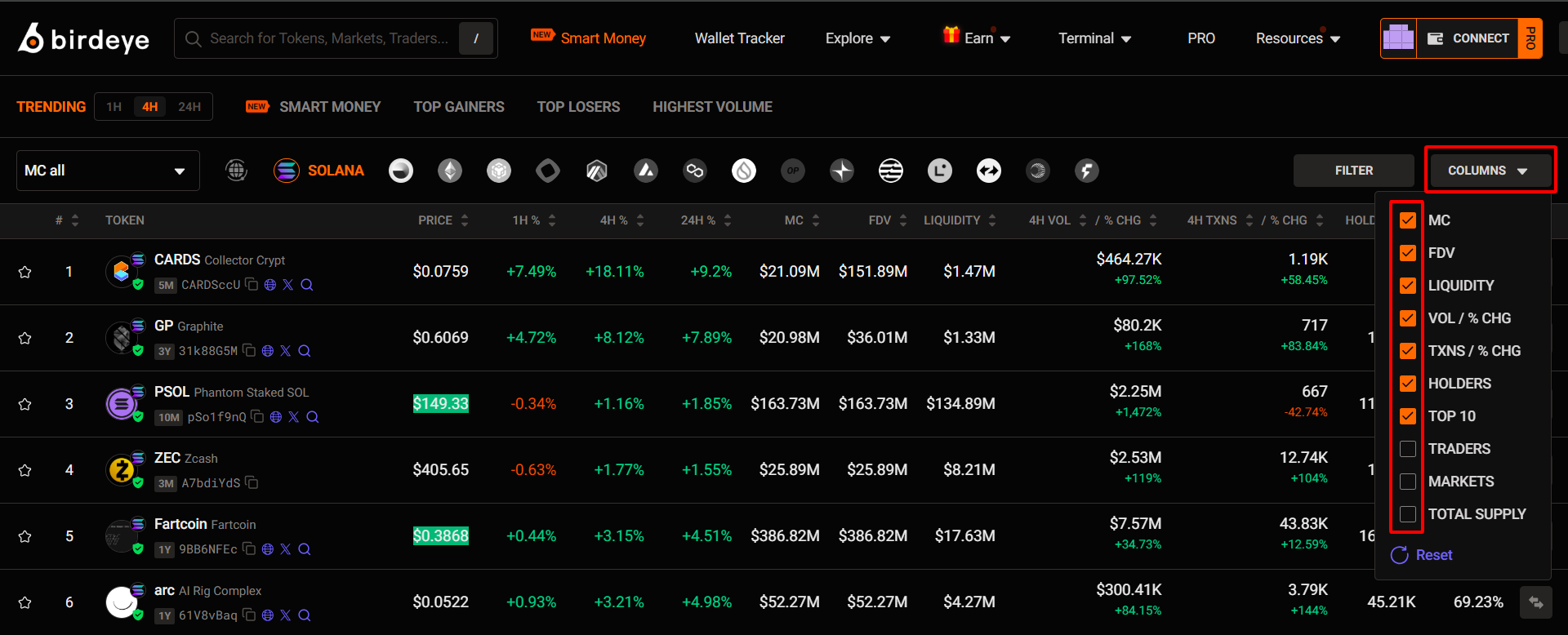 Categories like Trending, Top Gainers, Top Losers and Highest Volume provide pre-filtered lists of tokens based on popular criteria. This helps you quickly identify noteworthy tokens without having to filter them yourself.
