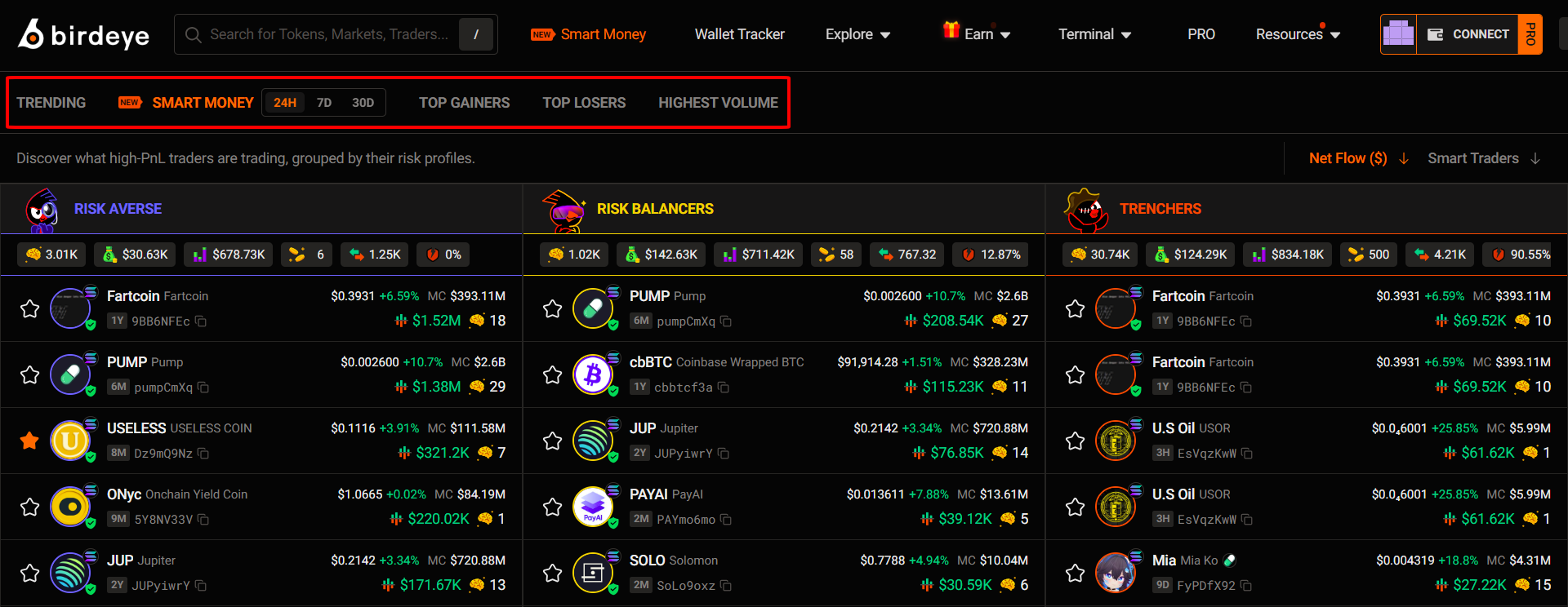 - Smart Money shows the tokens being accumulated by highly profitable and experienced traders (high-PnL wallets).