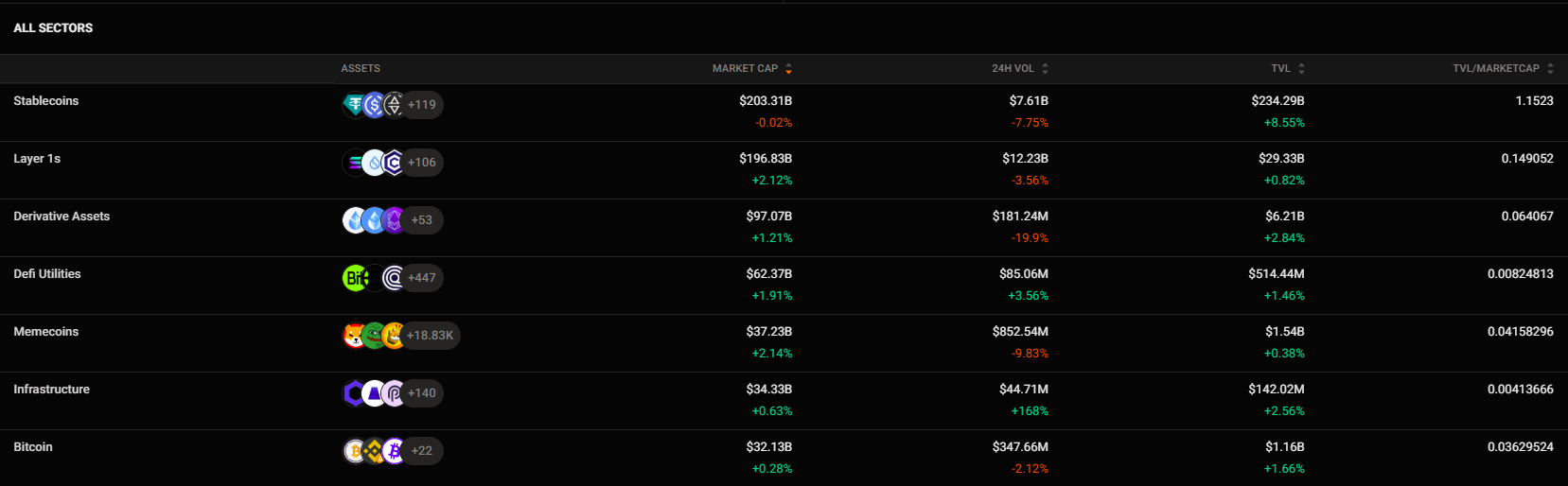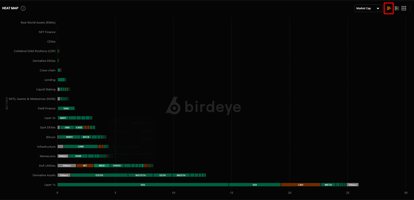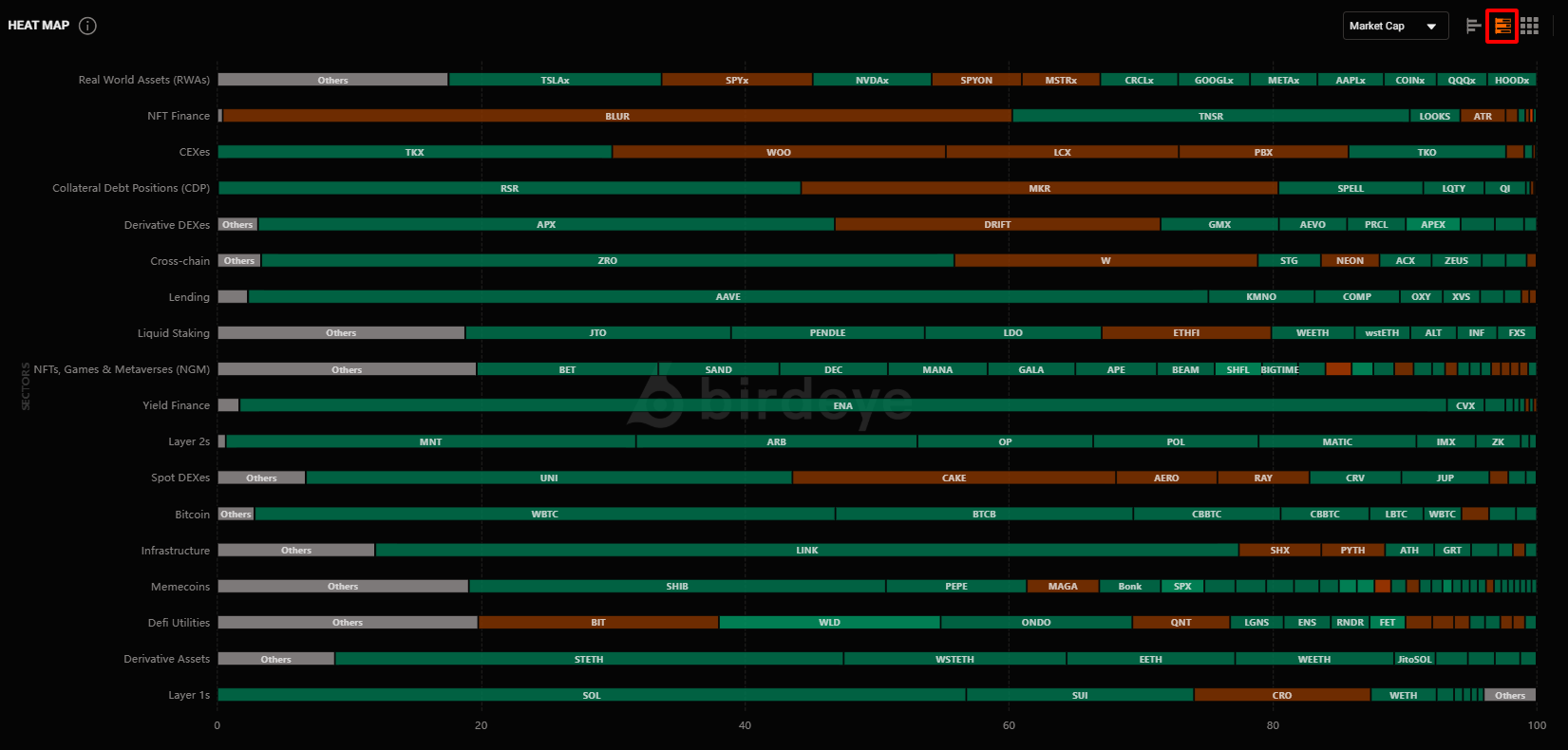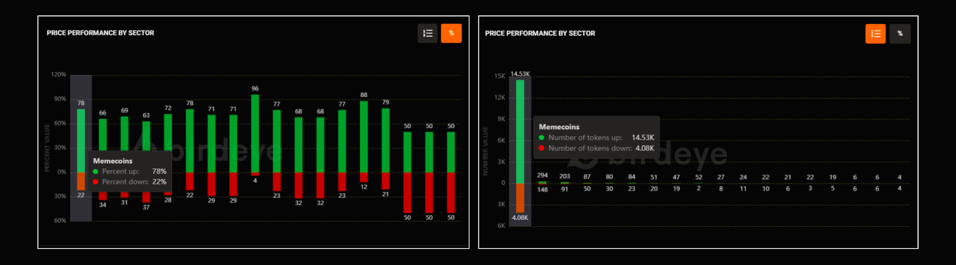 This is a visual chart that shows how many tokens within each sector have risen or fallen in price, along with the percentage change for each token.