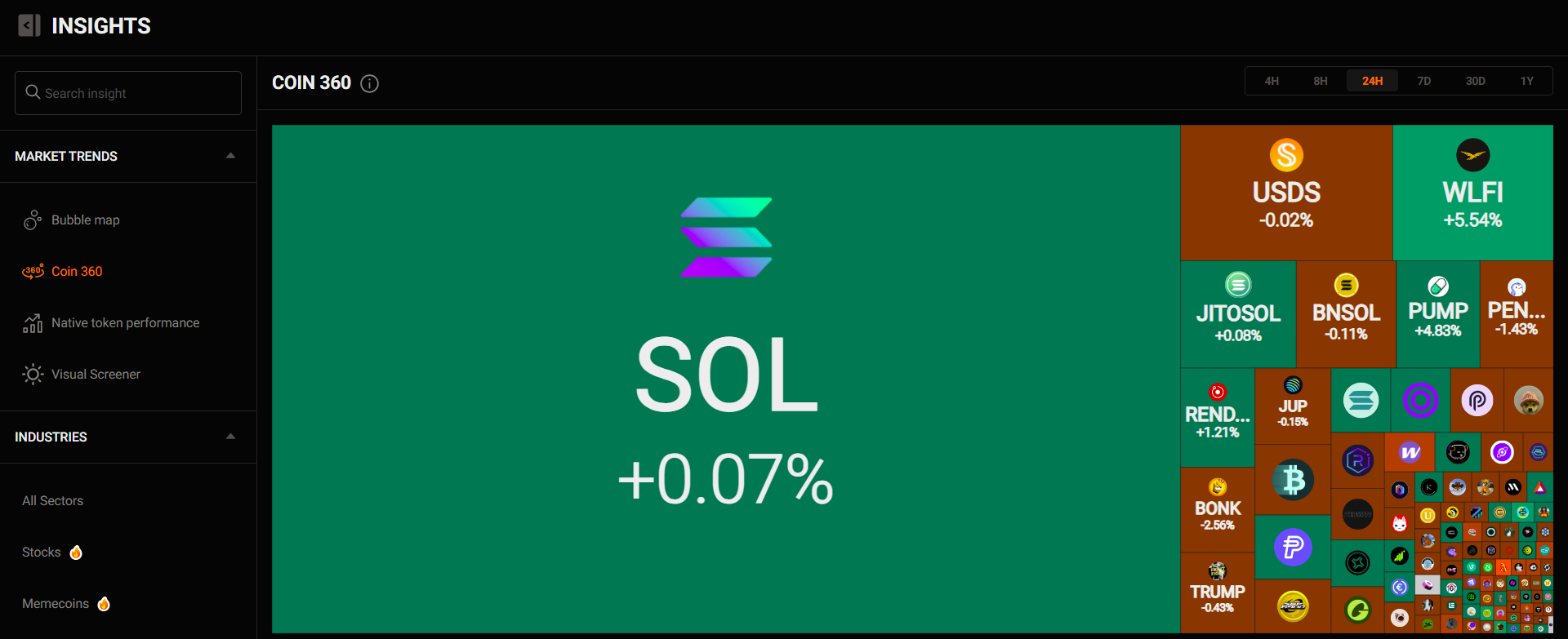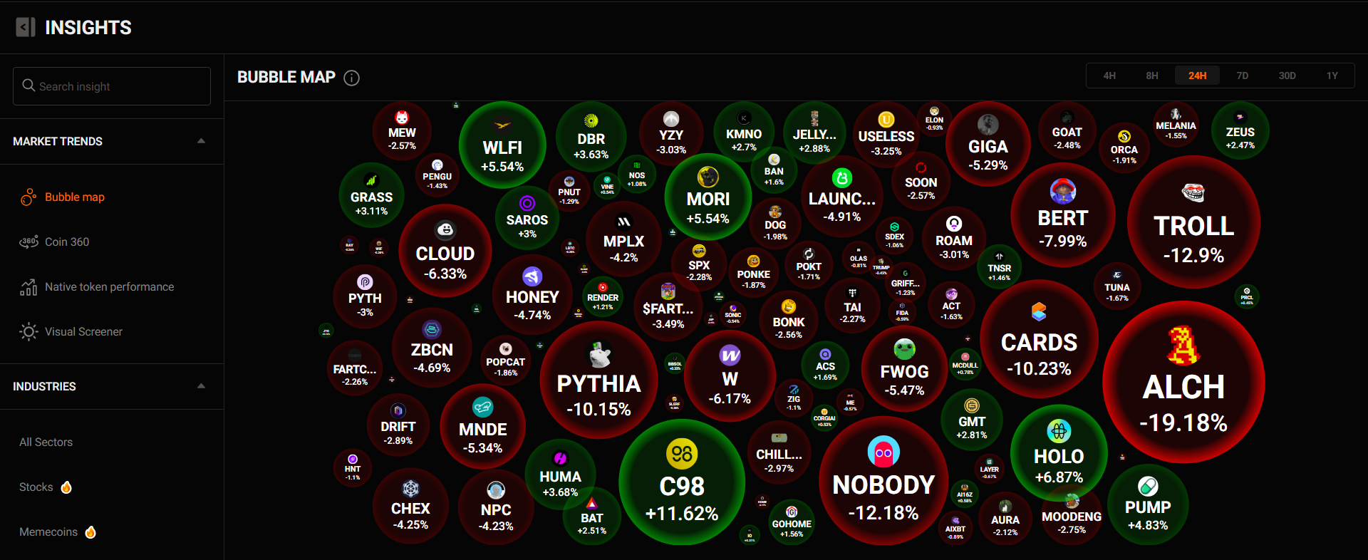 The bubble chart gives a visual snapshot of token price movements, helping you quickly identify which coins have gained or lost the most within different timeframes (in this example, 24H).