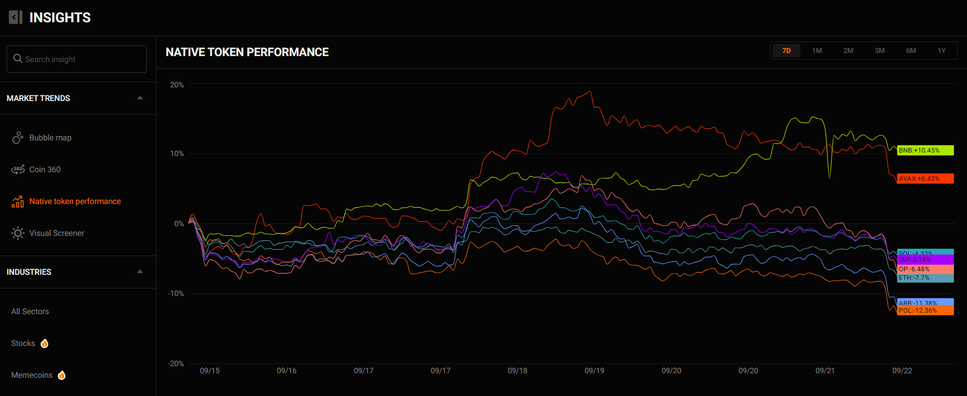 This chart shows the percentage change in the prices of native tokens such as BNB, AVAX, and SOL over time. It allows you to easily compare which blockchain ecosystems are strengthening or weakening within a given period (here, 7D - but you can switch to 1M, 2M,...).