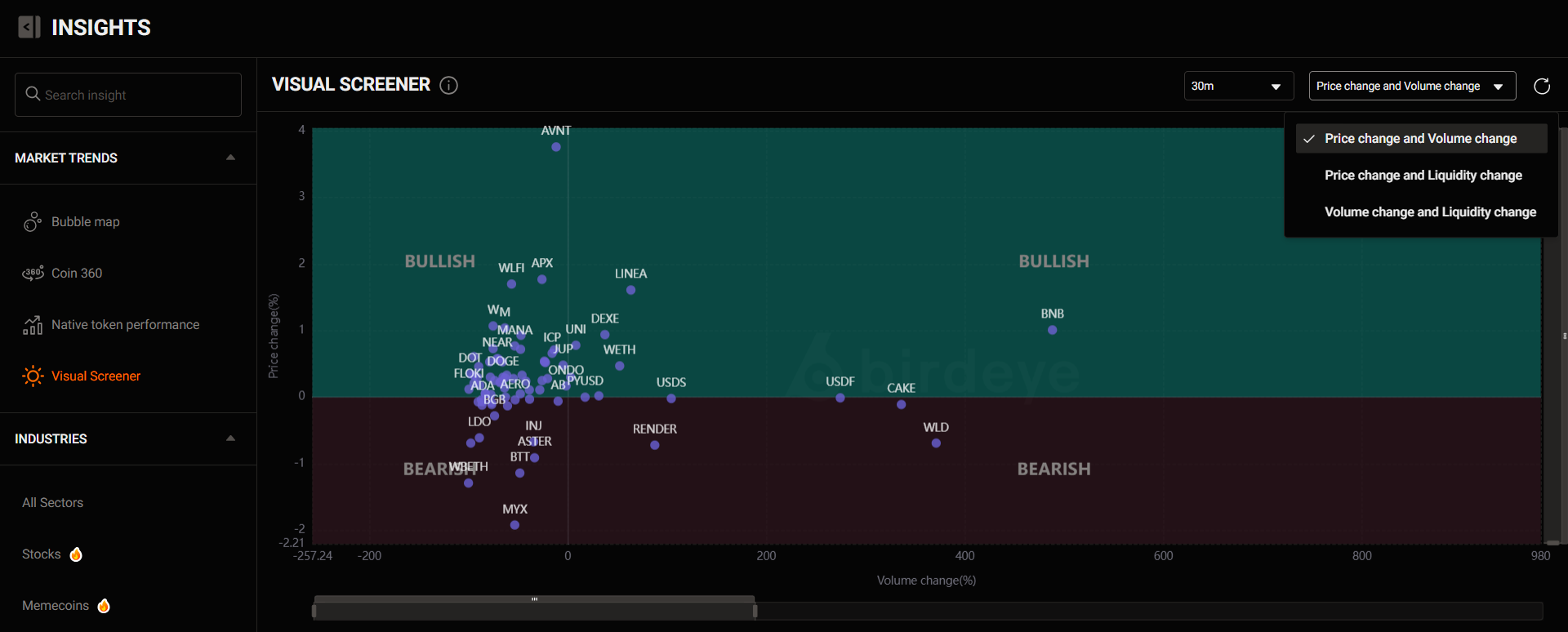 The Visual Screener chart displays price change (%) on the vertical axis and trading volume change (%) on the horizontal axis over different timeframes (here, the past 30 minutes). This helps you quickly spot which tokens are seeing strong buying momentum (Bullish) and which are under selling pressure (Bearish) within the timeframe you’ve set.