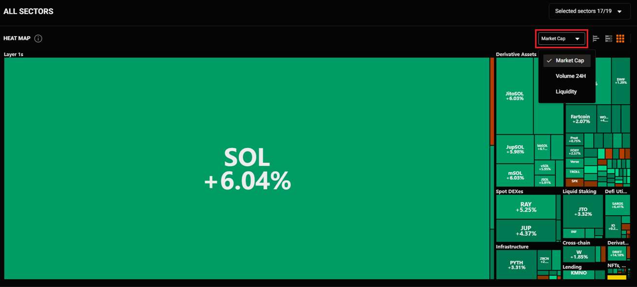 The Heat Map gives you a quick overview of the entire crypto market's performance by sector, based on market cap, 24h volume, and liquidity.