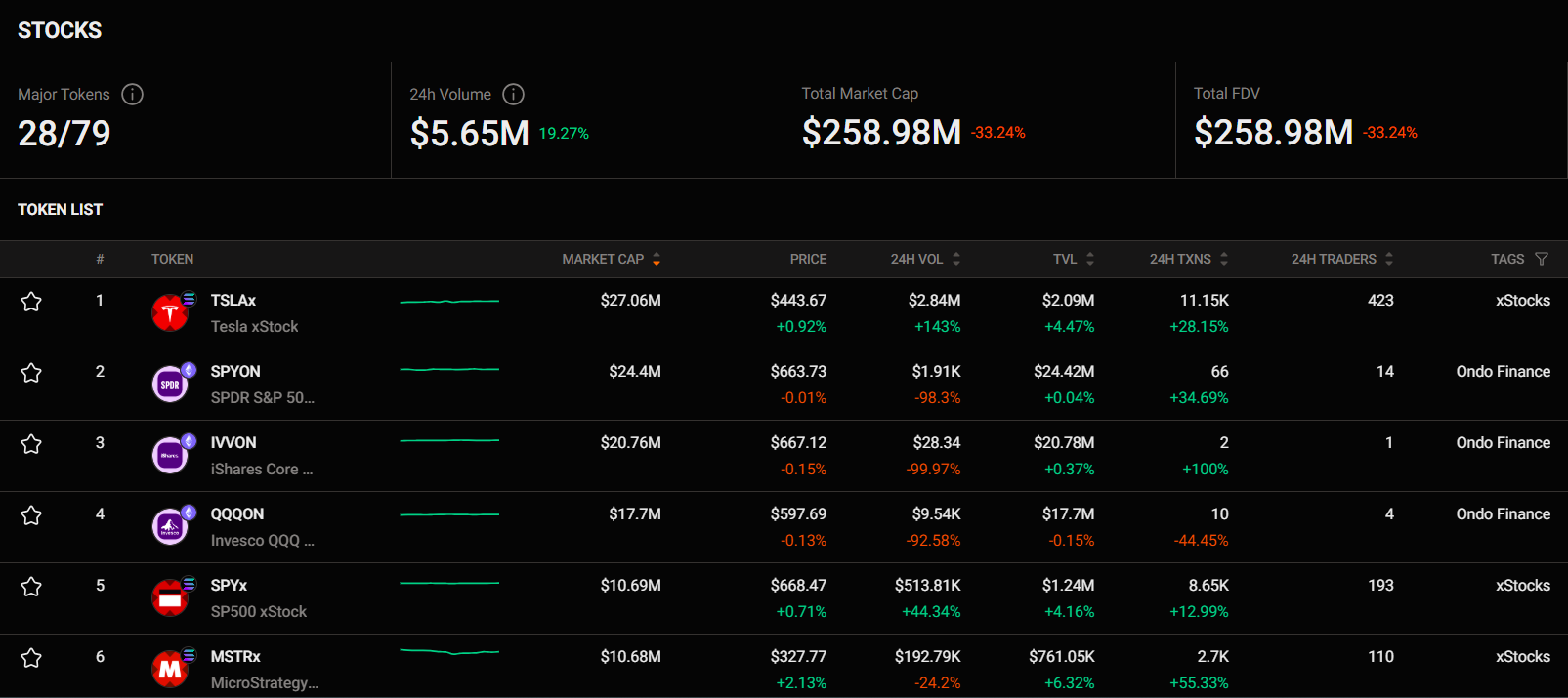 - Track market cap, price, volume, and trader activity of tokenized stocks in real time