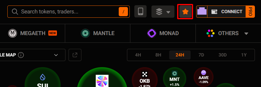 Whenever you find a token or trader (wallet) you want to save, find and click the star icon to add it to your watchlist.