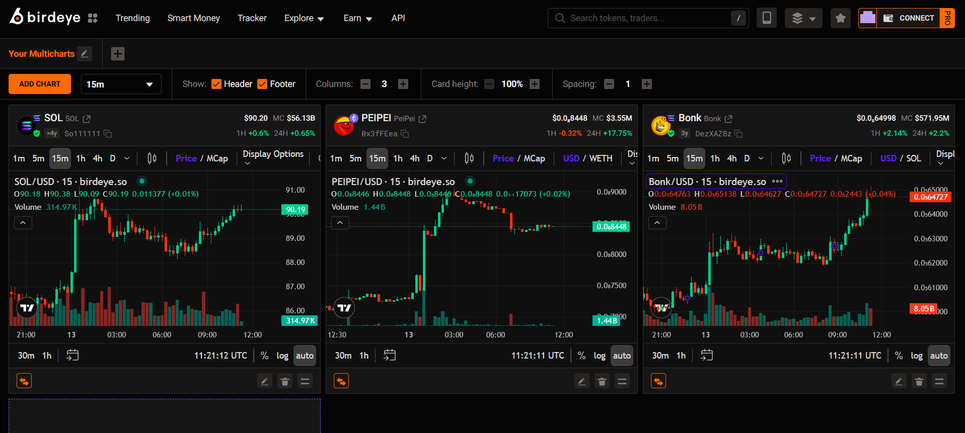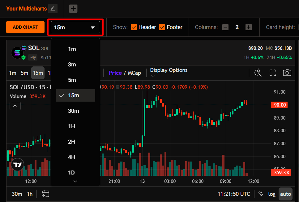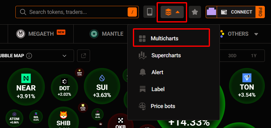 With Multicharts, you can view and compare all your favorite tokens on a single screen. Each layout supports up to 12 charts at once, so you can monitor the market and react instantly—never missing a market pulse.