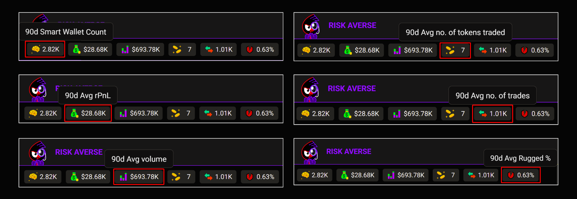 - 90d Avg Rugged %: Percentage of trades involving rugged tokens in the last 90 days. Lower values indicate lower risk