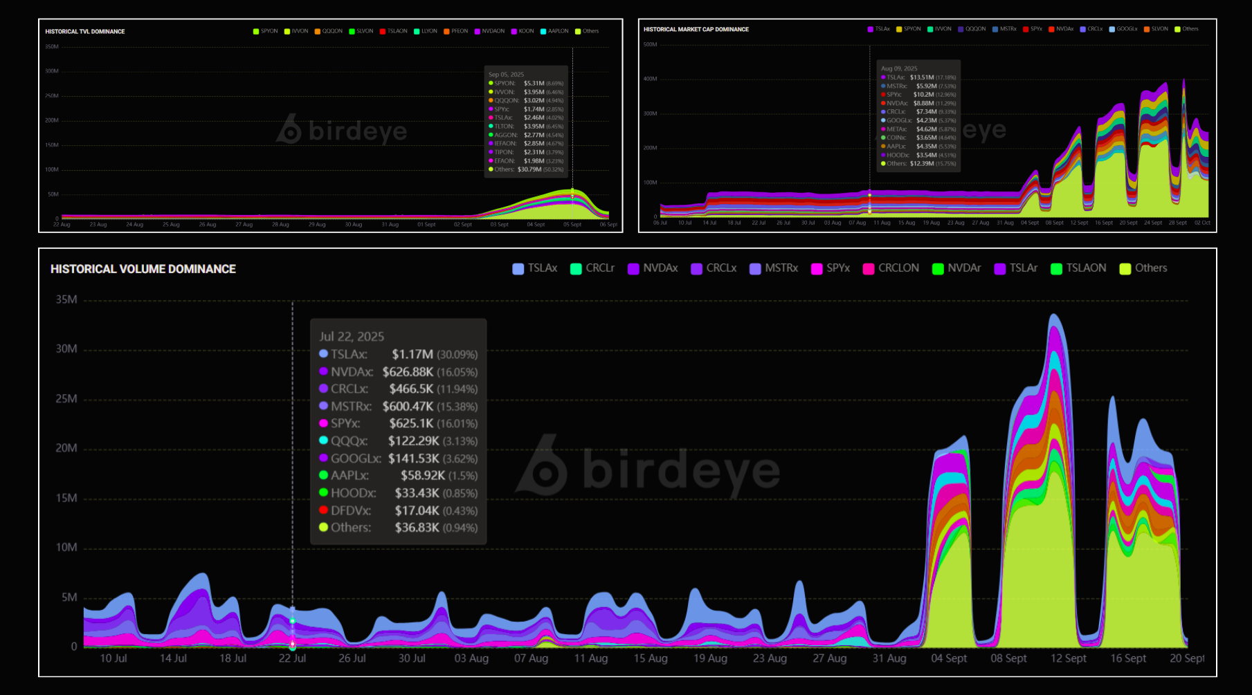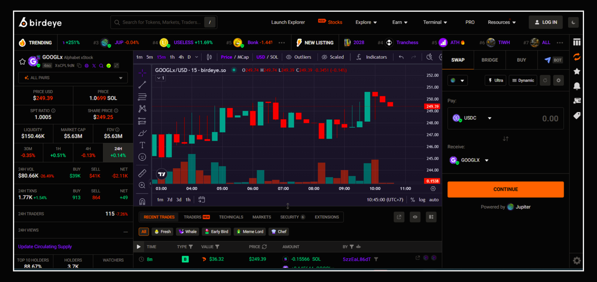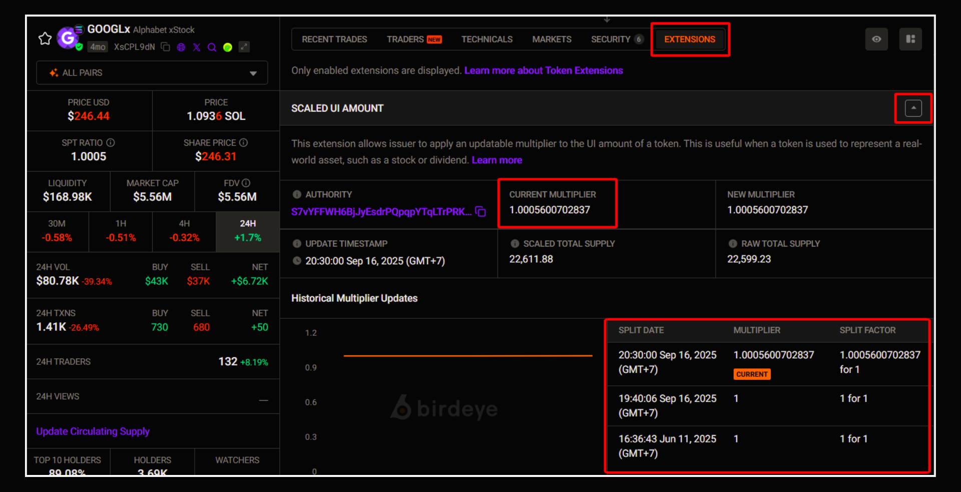 By clicking on a specific tokenize stocks, you can view its detailed page with price charts, liquidity, trading history, wallet insights, and more.