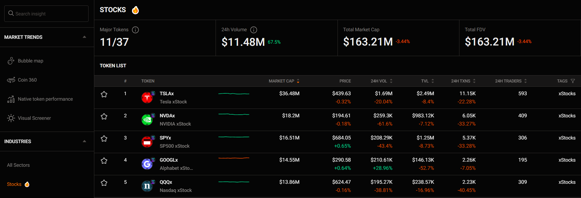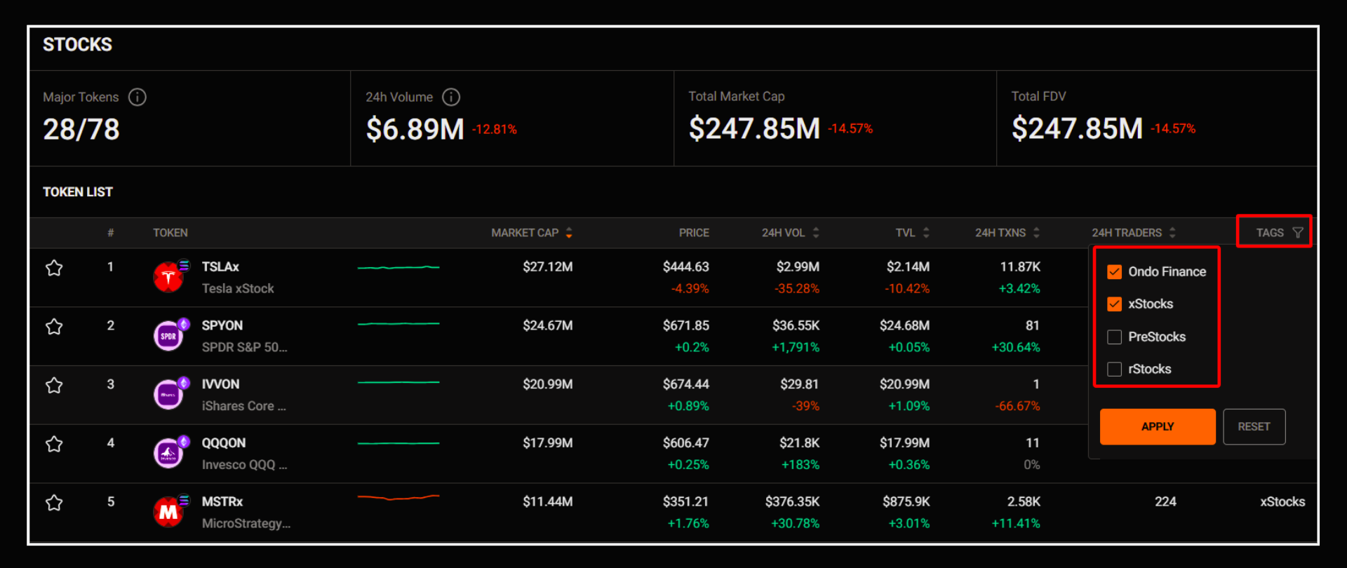 You'll see a list of tokenize stocks with key metrics like price, Market Cap, 24H Volume, TVL (Total Value Locked),…